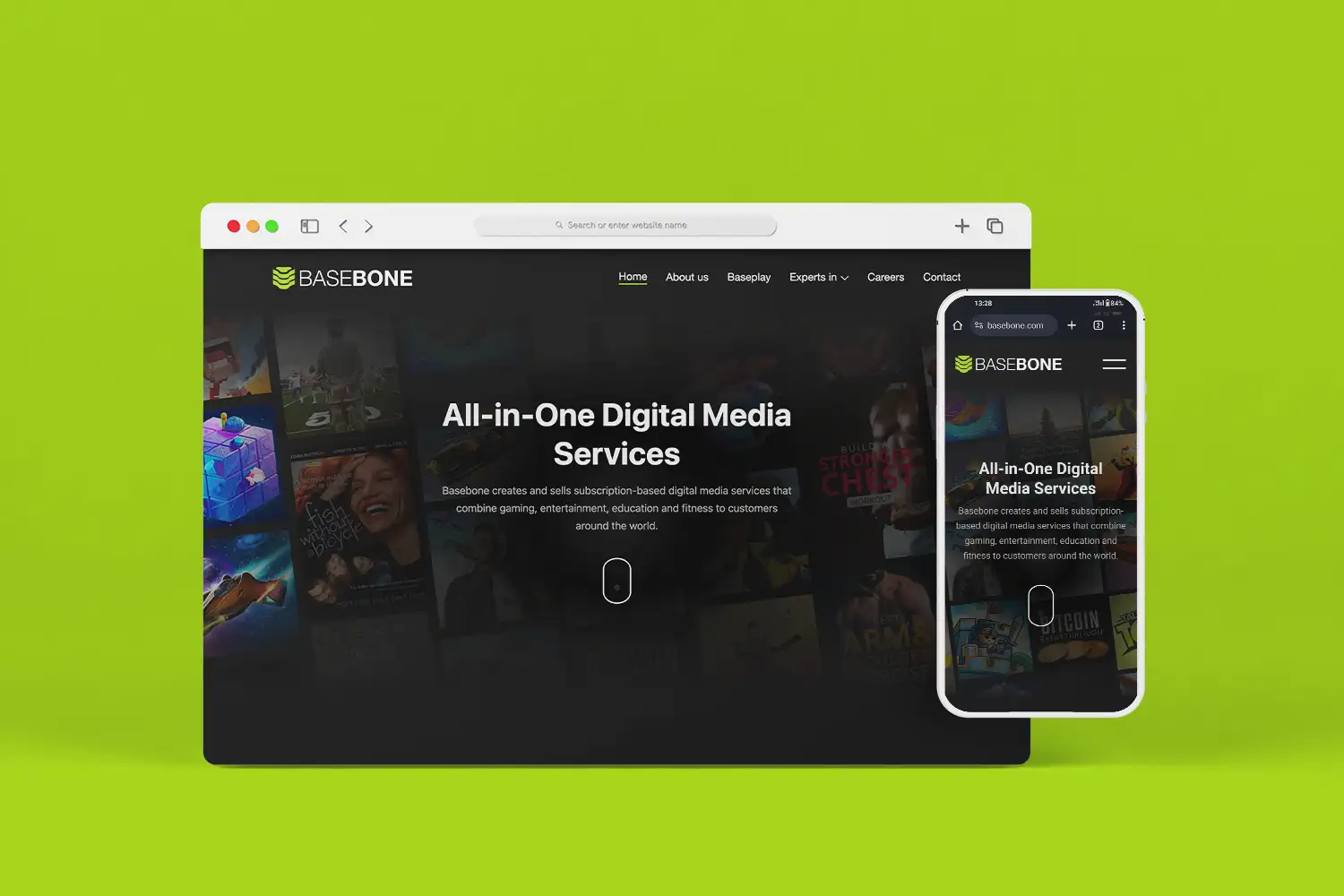 Una página Web que realza los servicios y productos de Basebone, que contribuye a transmitir una imagen de marca seria y profesional, y que se ajusta a los intereses y necesidades de los consumidores de entretenimiento.
