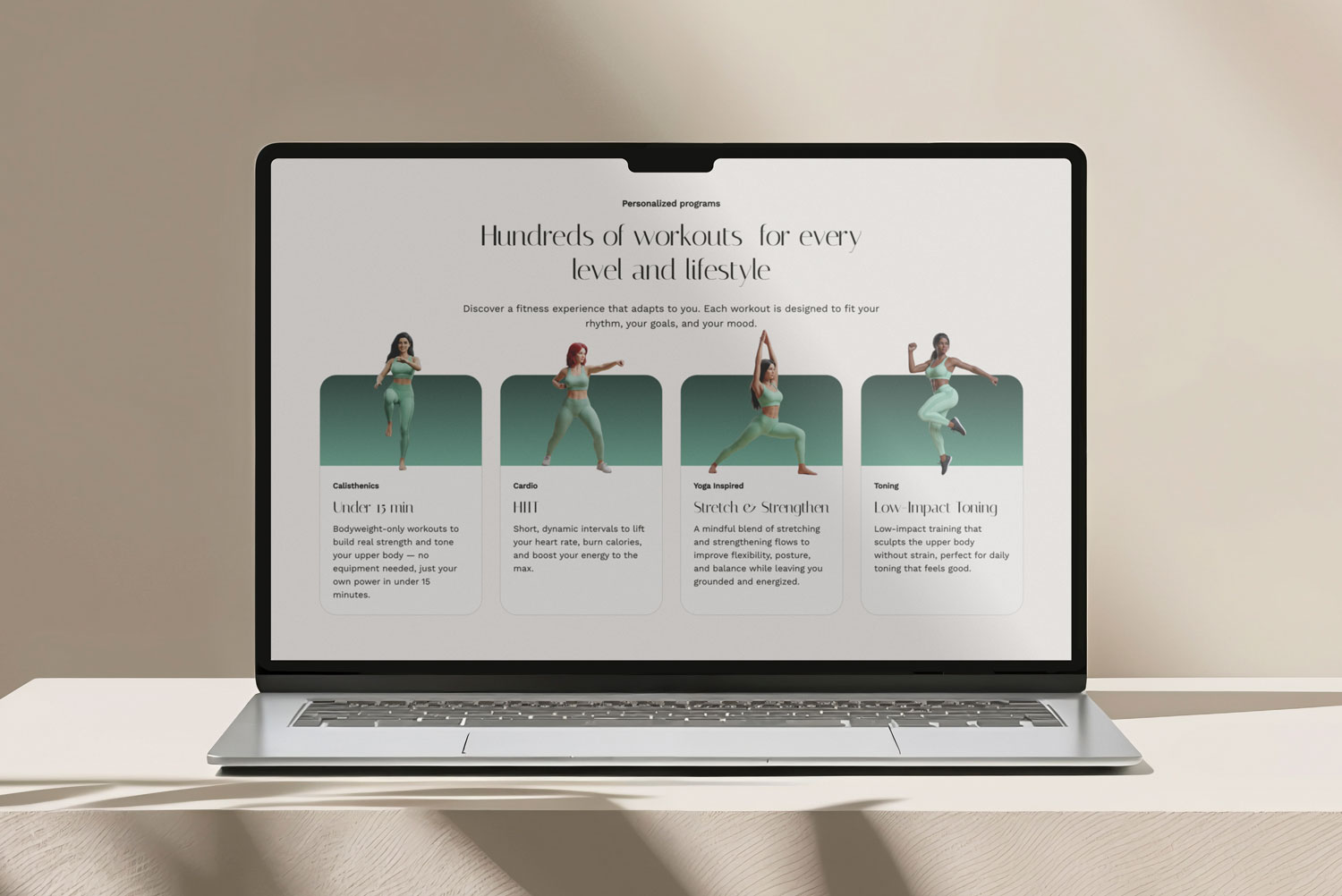El diseño de la web se ejecutó poniendo el foco total en la interfaz y la experiencia del usuario. Utilizamos la paleta de color verde primario (#7CA683) y tonos beige para construir una UI relajante y moderna. Implementamos las tipografías Italiana y Work Sans para jerarquizar la información con elegancia tanto en la web como en las pantallas de la app. El trabajo incluyó la integración de modelos 3D de alta calidad en las previsualizaciones de entrenamiento y la creación de imágenes promocionales impactantes, asegurando que la estética de la web y la app estuvieran perfectamente alineadas.