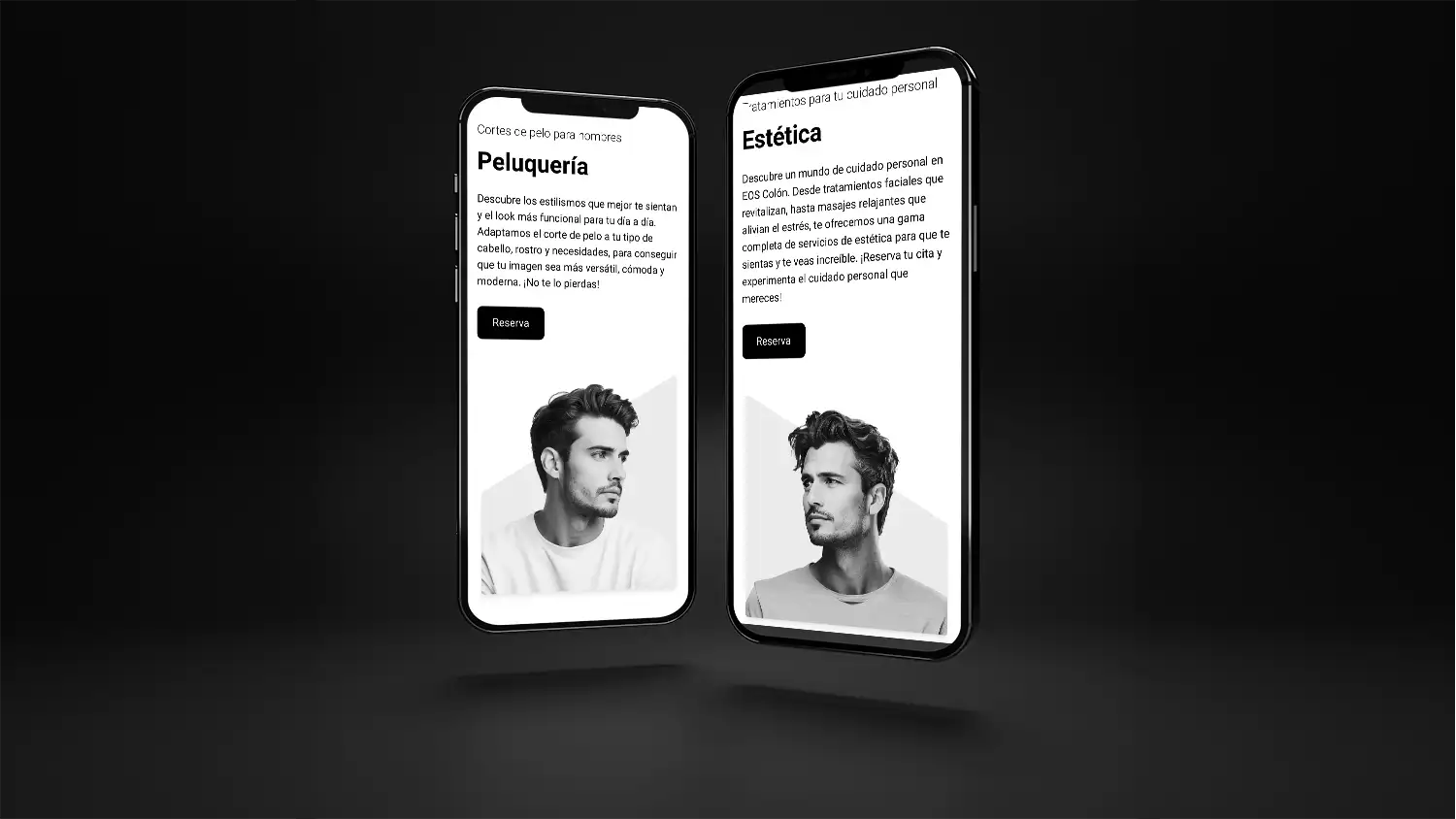 El diseño de la página Web se caracteriza por su simplicidad y elegancia. Utilizamos una combinación de blancos, negros y grises, siguiendo la imagen corporativa de EOS Men, que evoca la masculinidad, al mismo tiempo que la profesionalidad y calidad de los servicios, como valores principales de EOS. Las imágenes son en blanco y negro siguiendo la linea de imagen corporativa de EOS Men. La navegación es intuitiva, con secciones claramente definidas que permiten a los usuarios encontrar fácilmente la información que buscan.