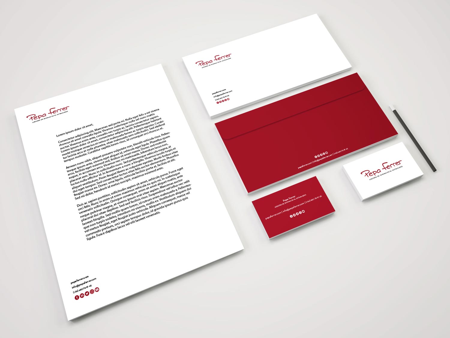 Elegimos una tonalidad de rojo virada a burdeos como color principal para transmitir la pasión que Pepa Ferrer siente por su trabajo y su calidez en el trato con sus alumnos.